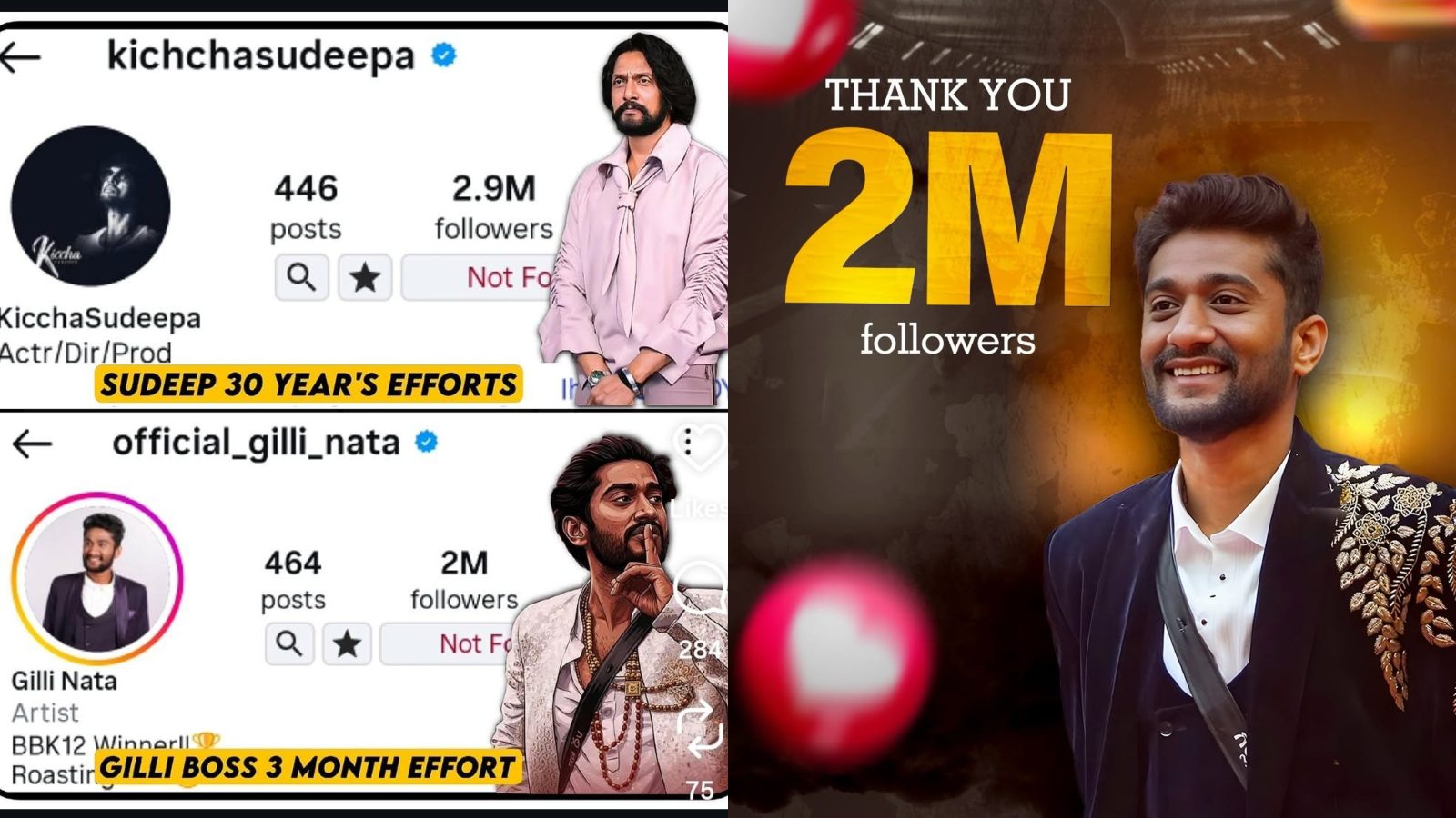 ಬಿಗ್ ಬಾಸ್ ಕನ್ನಡ 12 ವಿನ್ನರ್ ಗಿಲ್ಲಿ ಮನೆ ಒಳಗೆ ಕಾಲಿಟ್ಟ ದಿನದಿಂದಲೇ ಗೇಮ್ ಚೇಂಜ್ ಎಂಬ ಪಟ್ಟ ಗಿಟ್ಟಿಸಿಕೊಂಡವರು. ಮೊದಲಿಗೆ ಇನ್ಸ್ಟಾಗ್ರಾಮ್ ನಲ್ಲಿ ಕೇವಲ 2 ಲಕ್ಷ ಫಾಲೋವರ್ಸ್ ಇದ್ದ ಗಿಲ್ಲಿ, ಒಳ್ಳೆಯ ಕಂಟೆಂಟ್ ಹಾಕಿದ್ರೂ ಲೆಕ್ಕ ಜಾಸ್ತಿ ಆಗ್ತಿರಲಿಲ್ಲ. ಒಂದು ಮಿಲಿಯನ್ ಆದ್ರೆ ಸಾಕು ಅಂತ ಆಸೆಪಟ್ಟಿದ್ದವರು ಮನೆ ಒಳಗೆ ಆಟ ಶುರು ಮಾಡಿದ್ಮೇಲೆ literally ರಾಕೆಟ್ ಸ್ಪೀಡ್ ನಂತೆ ಫಾಲೋವರ್ಸ್ ಸಂಖ್ಯೆ ಏರಿಕೆ ಆಯ್ತು. ಈಗ ಗಿಲ್ಲಿಗೆ ಇರುವ 2 ಮಿಲಿಯನ್ ಫಾಲೋವರ್ಸ್ ಹಾಗೆ ಕಿಚ್ಚನನ್ನು ಫಾಲೋ ಮಾಡ್ತಿರುವ 2.9 ಫಾಲೋವರ್ಸ್ ಗೂ ಕಂಪರಿಷನ್ ಶುರುವಾಗಿದೆ.