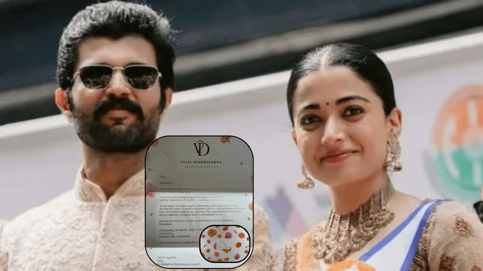 ಇತ್ತೀಚೆಗೆ ವಿಜಯ್ ಮತ್ತು ರಶ್ಮಿಕಾ ದಂಪತಿಗಳು ತಮ್ಮ ಆಪ್ತರಿಗೆ ಮದುವೆಯ ಆಮಂತ್ರಣ ಪತ್ರವನ್ನು ಹಂಚಲು ಪ್ರಾರಂಭಿಸಿದ್ದಾರೆ. ಈ ಪೈಕಿ ಆಮಂತ್ರಣ ಪಡೆದ ಅತಿಥಿಯೊಬ್ಬರು ಮದುವೆಯ ಕಾರ್ಡ್ ಫೋಟೋವನ್ನು ಸೋಷಿಯಲ್ ಮೀಡಿಯಾದಲ್ಲಿ ಹಂಚಿಕೊಂಡಿದ್ದು, ಅದು ಎಲ್ಲೆಡೆ ವೈರಲ್‌ ಆಗಿದೆ. ಸುಂದರವಾದ ವಿವಾಹದ ಬಾಕ್ಸ್ ಮೇಲೆ ವಿಜಯ್ ದೇವರಕೊಂಡ ಮತ್ತು ರಶ್ಮಿಕಾ ಮಂದಣ್ಣ ಎಂದು ಅಚ್ಚು ಹಾಕಲಾಗಿದ್ದು, ಮದುವೆಯ ದಿನಾಂಕವನ್ನು ಫೆಬ್ರವರಿ 26 ಎಂದು ಉಲ್ಲೇಖಿಸಲಾಗಿದೆ. ಈ ಆಮಂತ್ರಣ ಪತ್ರದ ವಿನ್ಯಾಸವು ಅತ್ಯಂತ ಸುಂದರವಾಗಿದ್ದು, ಅದ್ದೂರಿಯಾಗಿ ಮೂಡಿಬಂದಿದೆ.