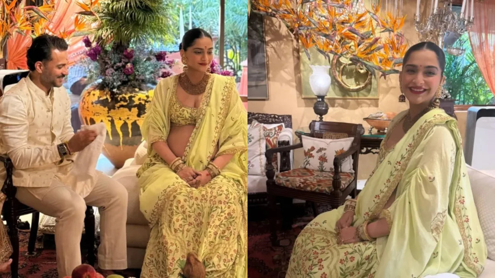 ಸೀಮಂತ ಶಾಸ್ತ್ರದ ದಿನ ಸೋನಂ ನಿಂಬೆ ಹಸಿರು ಬಣ್ಣದ ಲೆಹೆಂಗಾ ಹಾಗೂ ಅದಕ್ಕೆ ಹೊಂದುವ ಬ್ರೌಸ್ ಧರಿಸಿ ಮಿಂಚಿದರು. ಚಿನ್ನದ ನೆಕ್ಲೀಸ್, ಭಾರವಾದ ಜುಮುಕಿಗಳು, ಕಿವಿಯೋಲೆ, ಕಾಕ್ಟೈಲ್ ರಿಂಗ್, ಚೈನ್ ರಿಂಗ್ ಹಾಗೂ ಚಿನ್ನದ ಬಳೆಗಳೊಂದಿಗೆ ಸೋನಂ ಅವರ ಲುಕ್ ಎಲ್ಲರ ಗಮನ ಸೆಳೆಯಿತು.