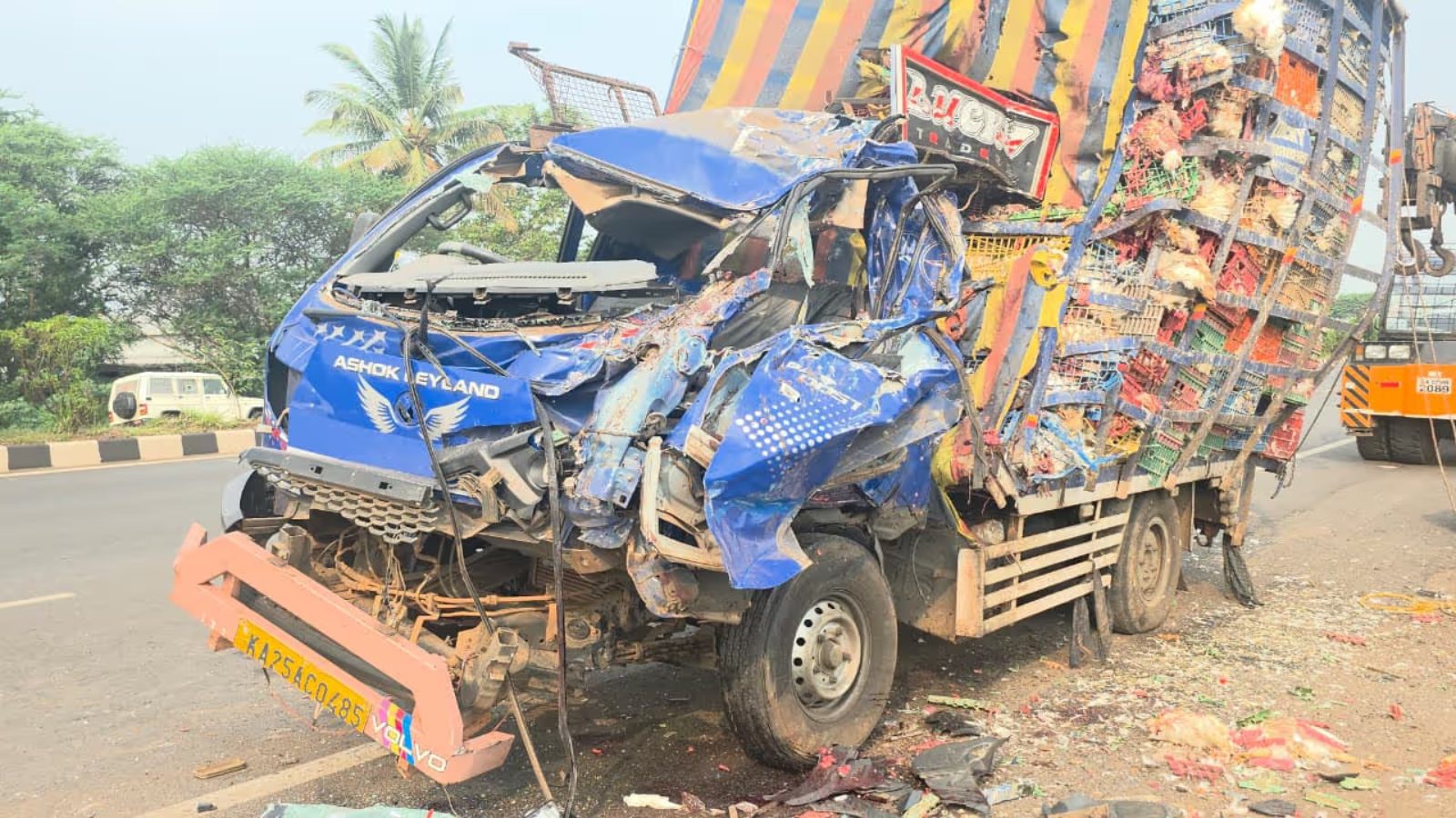 ಲಾರಿಯಲ್ಲಿ ಸಾಗಿಸುತ್ತಿದ್ದ ನೂರಾರು ಕೋಳಿಗಳು ಅಪಘಾತದಲ್ಲಿ ಮೃತಪಟ್ಟಿವೆ. ಘಟನಾ ಸ್ಥಳದಲ್ಲಿ ಕೋಳಿಗಳ ಮಾರಣಹೋಮವೇ ನಡೆದಂತಾಗಿದೆ.