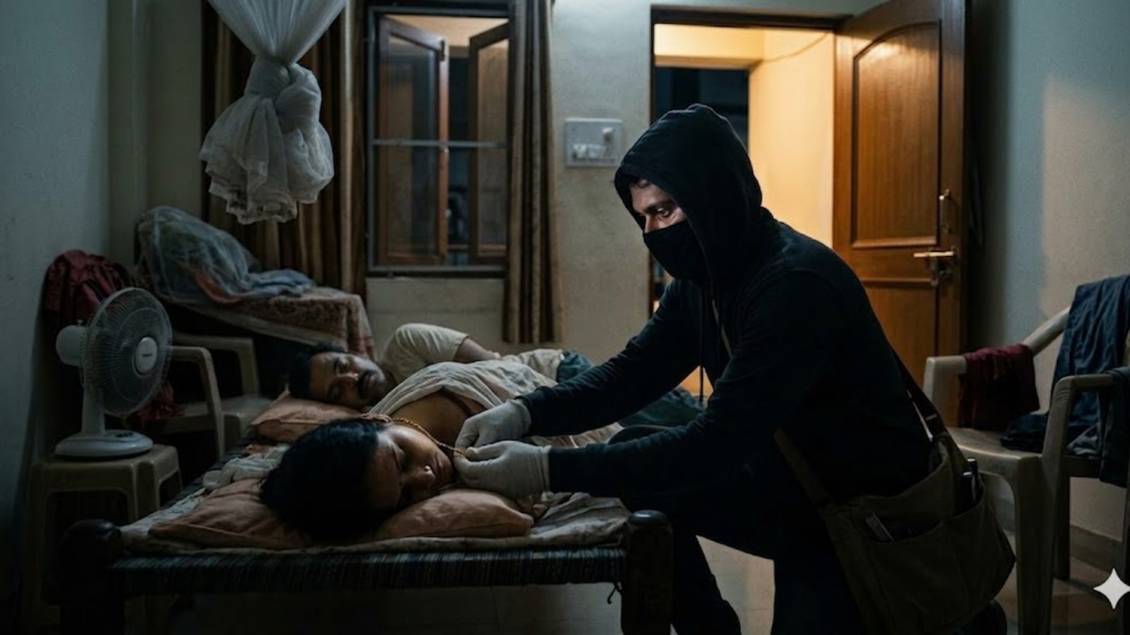ಬೇಸಿಗೆಯ ತೀವ್ರ ಸೆಕೆಯಿಂದಾಗಿ ರಾತ್ರಿ ಮನೆಯ ಬಾಗಿಲು ತೆರೆದಿಟ್ಟು ಮಲಗಿದ್ದ ಮಹಿಳೆಯೊಬ್ಬಳಿಗೆ ಕಳ್ಳರು ದುಬಾರಿ ಪಾಠ ಕಲಿಸಿದ್ದಾರೆ. ಮನೆಯೊಳಗೆ ನುಗ್ಗಿದ ಕಳ್ಳರು ಅವಳ ಚಿನ್ನದ ತಾಳಿ ಮತ್ತು ಎರಡು ಮೊಬೈಲ್ ಫೋನ್‌ಗಳನ್ನು ಕಳವು ಮಾಡಿ ಪರಾರಿಯಾಗಿದ್ದಾರೆ.