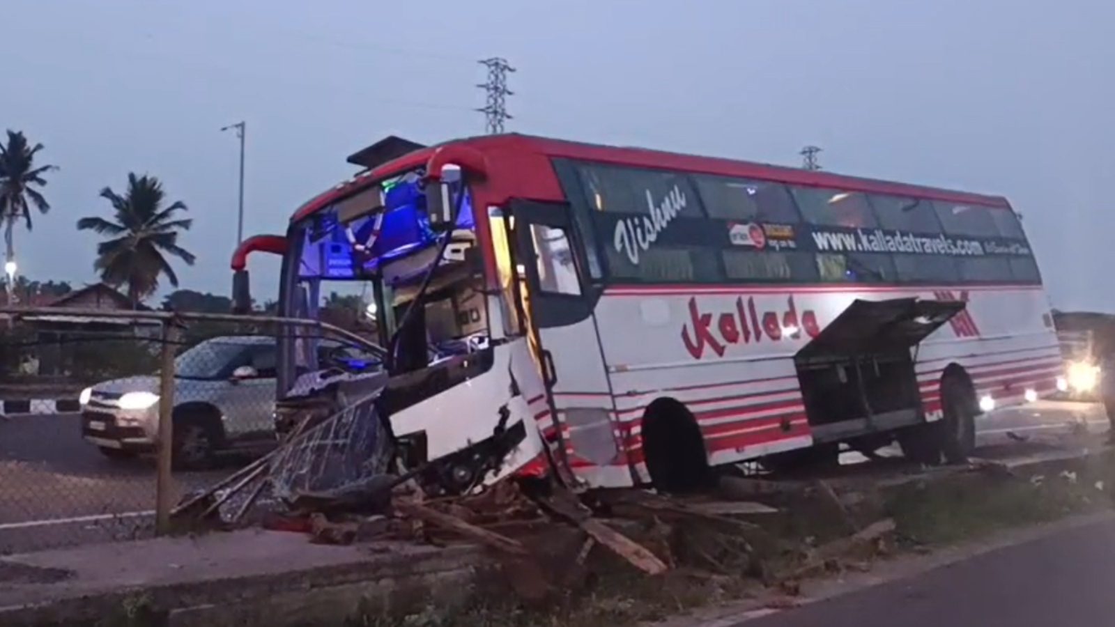 ಘಟನೆಯ ವಿವರ : ಮುಂಜಾನೆ ಸಮಯದಲ್ಲಿ ಕೇರಳದಿಂದ ಮಂಡ್ಯ ಮಾರ್ಗವಾಗಿ ಬೆಂಗಳೂರಿಗೆ ತೆರಳುತ್ತಿದ್ದ ಖಾಸಗಿ ಬಸ್‌ಗೆ ಮುಂದೆ ಹೋಗುತ್ತಿದ್ದ ಕಾರು ಡಿಕ್ಕಿ ಹೊಡೆದಿದೆ. ಡಿಕ್ಕಿಯ ಪರಿಣಾಮ ಬಸ್ ನಿಯಂತ್ರಣ ತಪ್ಪಿ ರಸ್ತೆ  ಪಕ್ಕದ ತಡೆಗೋಡೆ ಮತ್ತು ಚರಂಡಿಗೆ ನುಗ್ಗಿ ನಿಂತಿದೆ.