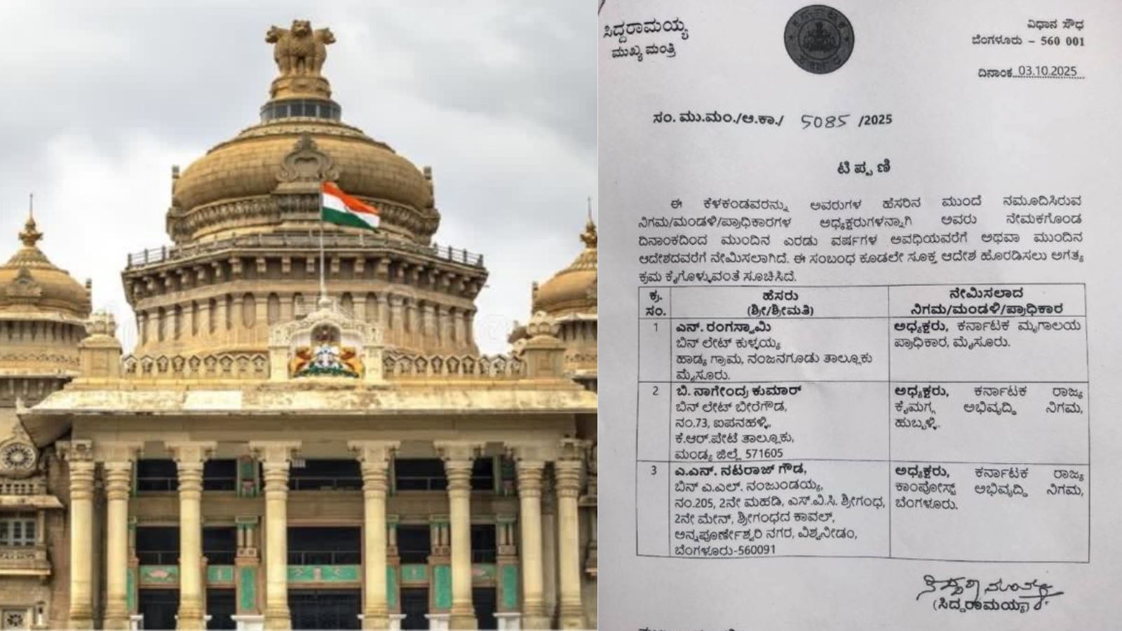 ಬೆಂಗಳೂರು: ರಾಜ್ಯ ಸರ್ಕಾರವು ಮೂರು ವಿವಿಧ ನಿಗಮ ಮತ್ತು ಪ್ರಾಧಿಕಾರಗಳ ಅಧ್ಯಕ್ಷರ ನೇಮಕಾತಿಗೆ ಅನುಮೋದನೆ ನೀಡಿದೆ. ಈ ನೇಮಕಾತಿಗಳಿಗೆ ಸಂಬಂಧಿಸಿದ ಆದೇಶವನ್ನು ಬುಧವಾರ(ಅ.8) ಅಧಿಕೃತವಾಗಿ ಹೊರಡಿಸಲಾಗಿದೆ.