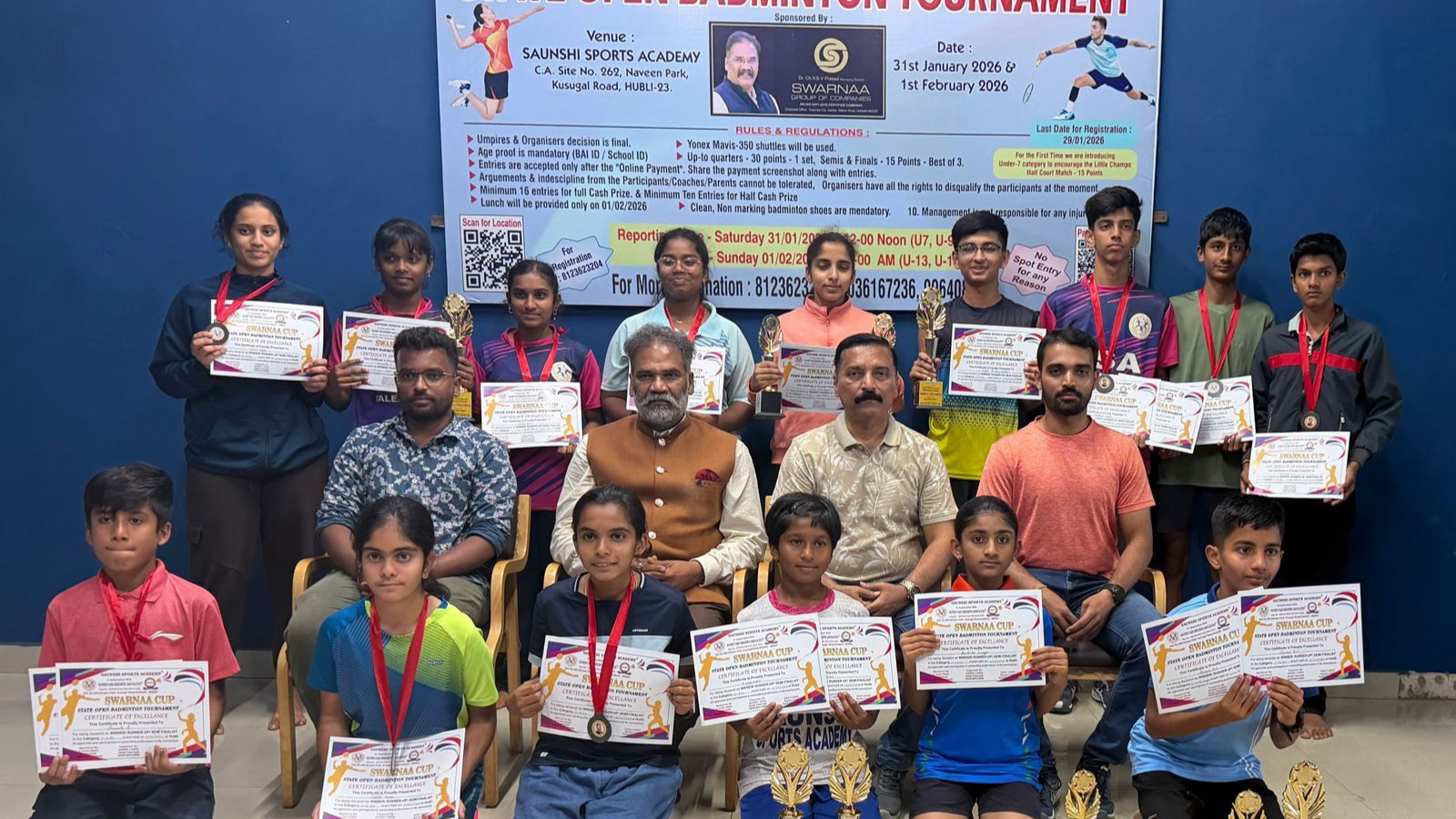 ಬೆಂಗಳೂರು: ನವೀನ ಪಾರ್ಕ್ ನಿವಾಸಿಗಳ ಸಂಘದ ಸಹಯೋಗದೊಂದಿಗೆ ಸಂಶಿ ಸ್ಪೋರ್ಟ್ಸ್ ಅಕಾಡೆಮಿಯಲ್ಲಿ ದಿನಾಂಕ : 31/01/2026 ಹಾಗೂ 01/02/2026 2 ದಿನಗಳ ಕಾಲ “ಸ್ವರ್ಣಾ ಕಪ್” ರಾಜ್ಯ ಮಟ್ಟದ ಬ್ಯಾಡ್ಮಿಂಟನ್ ಪಂದ್ಯಾವಳಿಯನ್ನು ಆಯೋಜಿಸಲಾಗಿತ್ತು. ಪಂದ್ಯಾವಳಿಯಲ್ಲಿ ರಾಜ್ಯದ ಹಾವೇರಿ, ದಾವಣಗೇರೆ, ಶಿವಮೊಗ್ಗ, ಧಾರವಾಡ, ಉ.ಕನ್ನಡ, ಬೆಳಗಾವಿ, ಬಳ್ಳಾರಿ, ಗದಗ, ಹೊಸಪೇಟ್, ರಾಯಚೂರು, ಹಾಗೂ ಹಲವಾರು ಜಿಲ್ಲೆಗಳಿಂದ ಒಟ್ಟು 105 ಯುವ ಕ್ರೀಡಾ ಪಟುಗಳು ಭಾಗವಹಿಸಿದ್ದರು.