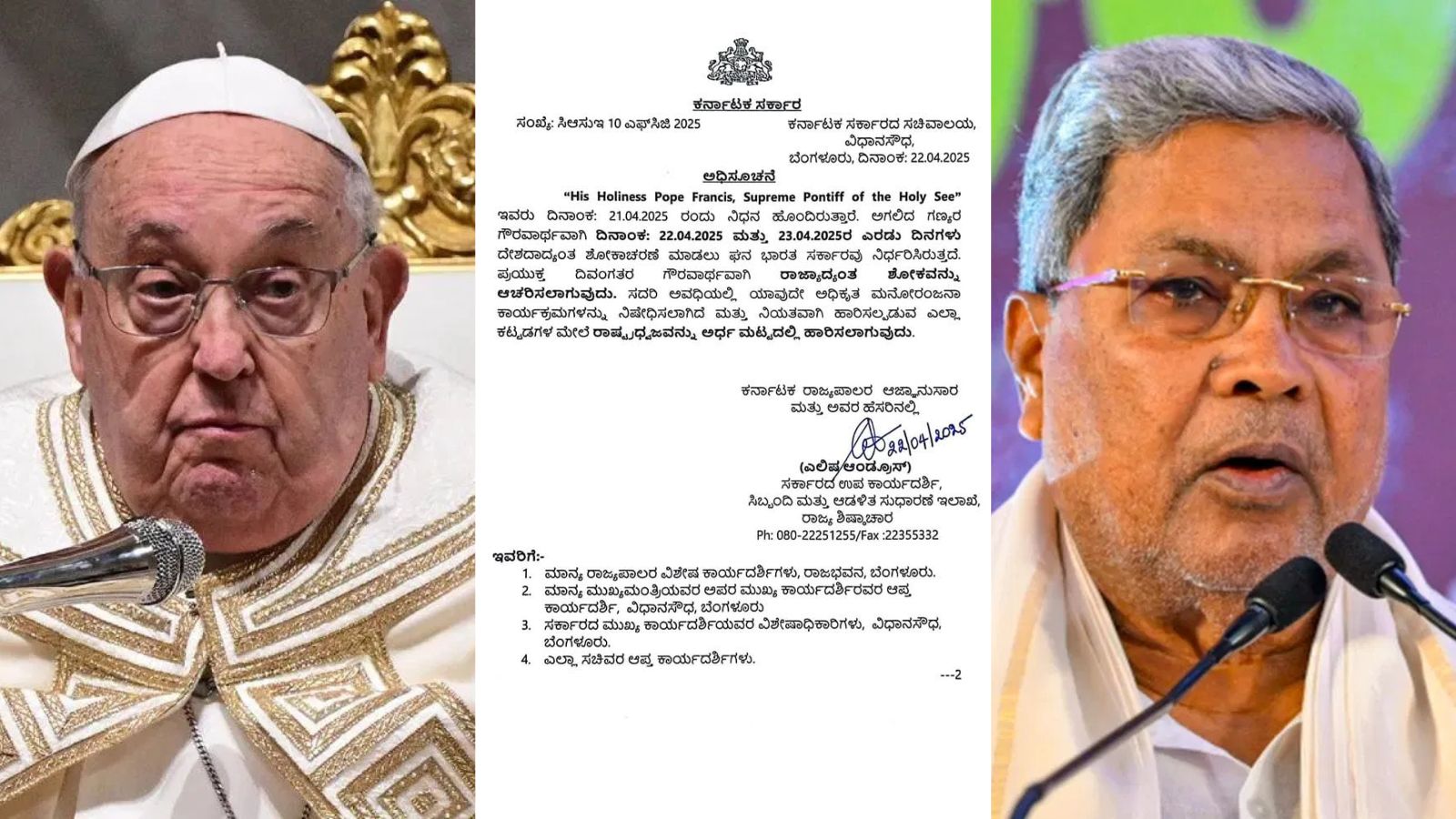 ಪೋಪ್ ಫ್ರಾನ್ಸಿಸ್ ನಿಧನಕ್ಕೆ ಗೌರವ ಸೂಚಿಸಿ ಭಾರತ ಸರ್ಕಾರ ಏಪ್ರಿಲ್ 22 ಮತ್ತು 23ರಂದು ಎರಡು ದಿನಗಳ ಶೋಕಾಚರಣೆ ಘೋಷಿಸಿದೆ. ಈ ಸಮಯದಲ್ಲಿ ದೇಶಾದ್ಯಂತ ಎಲ್ಲಾ ಸರ್ಕಾರಿ ಕಟ್ಟಡಗಳಲ್ಲಿ ರಾಷ್ಟ್ರಧ್ವಜವನ್ನು ಅರ್ಧಮಟ್ಟದಲ್ಲಿ ಹಾರಿಸಲಾಗುವುದು. ಯಾವುದೇ ಸರ್ಕಾರಿ ಮನೋರಂಜನಾ ಕಾರ್ಯಕ್ರಮಗಳು ನಡೆಯುವುದಿಲ್ಲ ಎಂದು ಪ್ರಕಟಣೆ ತಿಳಿಸಿದೆ. ರಾಜ್ಯ ಸರ್ಕಾರಗಳು ಕೂಡ ಈ ಆದೇಶವನ್ನು ಅನುಸರಿಸಲಿದೆ.
