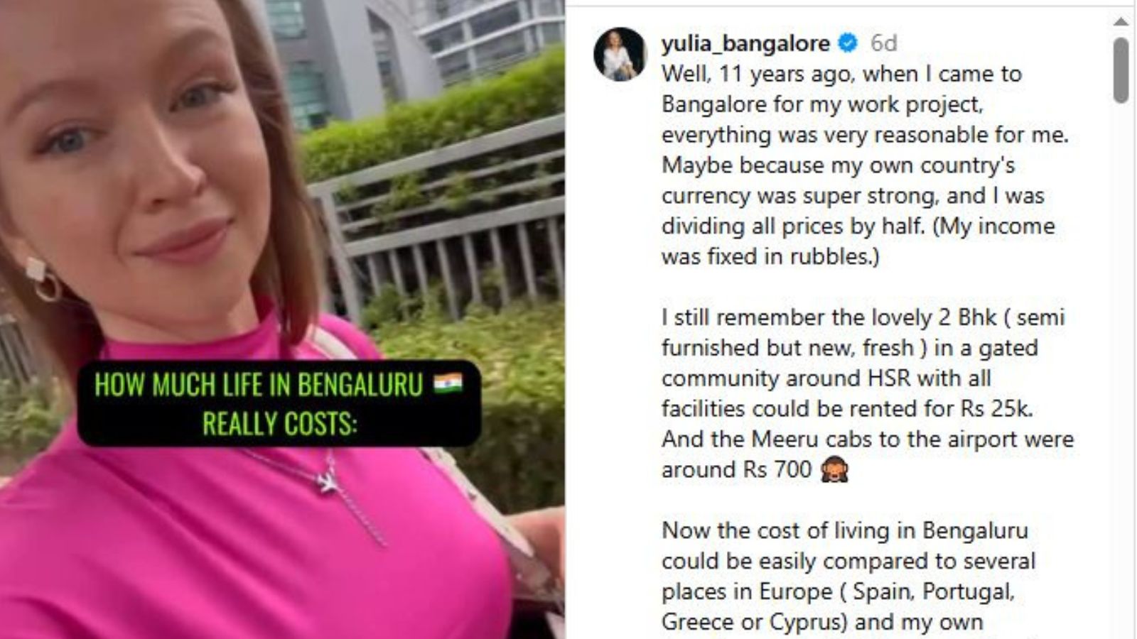 ನಾನು 11 ವರ್ಷಗಳ ಹಿಂದೆ ಉದ್ಯೋಗದ ಸಲುವಾಗಿ ಬೆಂಗಳೂರಿಗೆ ಬಂದೆ. ಪ್ರಾರಂಭದಲ್ಲಿ ನನ್ನ ದೇಶದ ಕರೆನ್ಸಿಯನ್ನು ಭಾರತೀಯ ರೂಪಾಯಿಗೆ ಪರಿವರ್ತಿಸುತ್ತಿದ್ದೆ. ಆ ಸಮಯದಲ್ಲಿ ರಷ್ಯಾದ ರೂಬಲ್ ಭಾರತೀಯ ರೂಪಾಯಿಗಿಂತ ಬಲವಾಗಿತ್ತು. ಆದರೆ ಇಂದು ಸ್ಥಿತಿ ಸಂಪೂರ್ಣವಾಗಿ ಬದಲಾಗಿದೆ ಎಂದು ಯೂಲಿಯಾ ತಮ್ಮ ವಿಡಿಯೋದಲ್ಲಿ ವಿವರಿಸಿದ್ದಾರೆ.