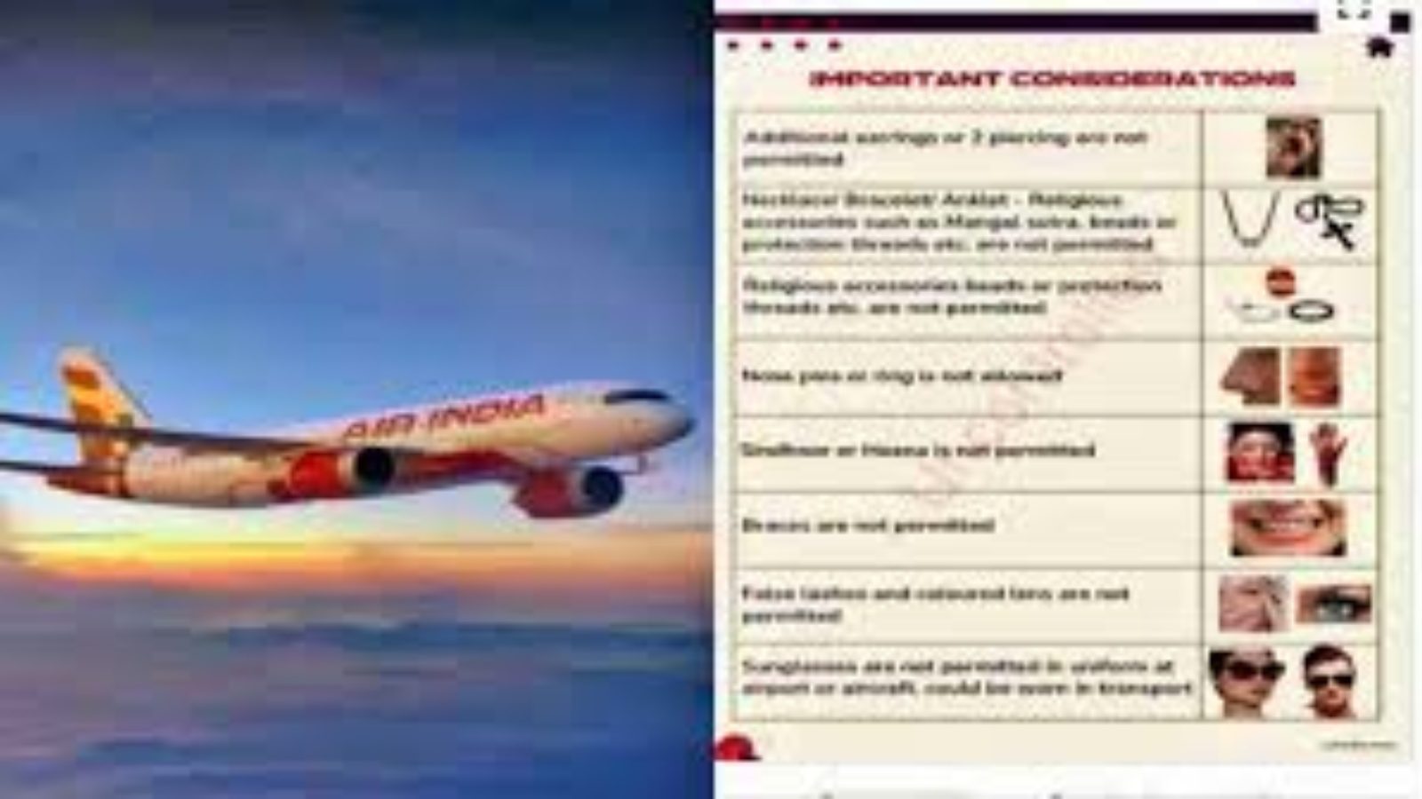ಏರ್ ಇಂಡಿಯಾ ಹೊರಡಿಸಿರುವ ಹೊಸ ಮಾರ್ಗಸೂಚಿಗಳಲ್ಲಿ ಮಹಿಳಾ ಸಿಬ್ಬಂದಿಗಳು ದೊಡ್ಡ ಬಿಂದಿ ಅಥವಾ ಗಾಢ ಸಿಂಧೂರ ಧರಿಸುವಂತಿಲ್ಲ ಎಂದು ಸೂಚಿಸಲಾಗಿದೆ. ಅಲ್ಲದೆ, ಪುರುಷ ಸಿಬ್ಬಂದಿಗಳು ಕೈಗೆ ಕಟ್ಟುವ ಧಾರ್ಮಿಕ ದಾರ ಅಥವಾ ಧಾರ್ಮಿಕ ಉಂಗುರಗಳನ್ನು ಧರಿಸುವಂತಿಲ್ಲ ಎಂಬ ನಿಯಮವೂ ಇದೆ ಎಂದು ವರದಿಯಾಗಿದೆ.