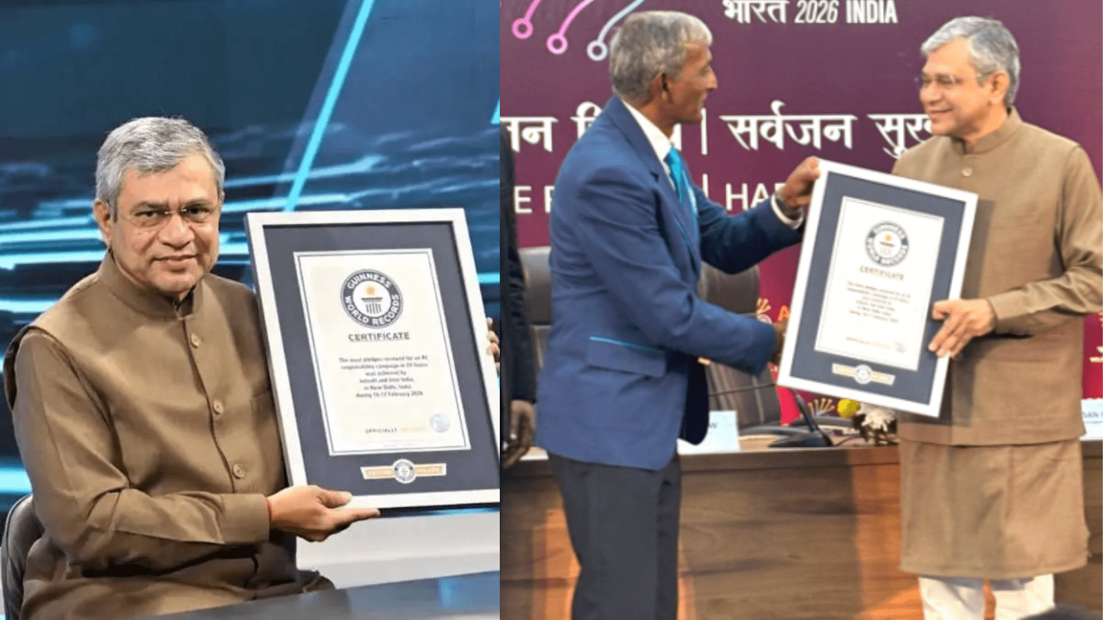 ಕೇಂದ್ರ ಎಲೆಕ್ಟ್ರಾನಿಕ್ಸ್ ಮತ್ತು ಮಾಹಿತಿ ತಂತ್ರಜ್ಞಾನ ಸಚಿವ ಅಶ್ವಿನಿ ವೈಷ್ಣವ್ ಅವರು ಬುಧವಾರ ಈ ಮಹತ್ವದ ಘೋಷಣೆಯನ್ನು ಮಾಡಿದರು. ಫೆಬ್ರವರಿ 16 ಮತ್ತು 17ರ ನಡುವೆ ನಡೆದ ಈ ವಿಶೇಷ ಅಭಿಯಾನದಲ್ಲಿ ಒಟ್ಟು 2,50,946 ಮಾನ್ಯ ಪ್ರತಿಜ್ಞೆಗಳು ಸಲ್ಲಿಕೆಯಾಗಿವೆ. ʼ24 ಗಂಟೆಗಳಲ್ಲಿ AI ಜವಾಬ್ದಾರಿ ಅಭಿಯಾನಕ್ಕಾಗಿ ಸ್ವೀಕರಿಸಿದ ಹೆಚ್ಚಿನ ಪ್ರತಿಜ್ಞೆಗಳುʼ ಎಂಬ ವಿಭಾಗದಲ್ಲಿ , ಗಿನ್ನೆಸ್ ವಿಶ್ವ ದಾಖಲೆಗಳ ತೀರ್ಪುಗಾರರು ಈ ಸಾಧನೆಯನ್ನು ಅಧಿಕೃತವಾಗಿ ಪರಿಶೀಲಿಸಿ ಪ್ರಶಸ್ತಿ ಪ್ರದಾನ ಮಾಡಿದ್ದಾರೆ.