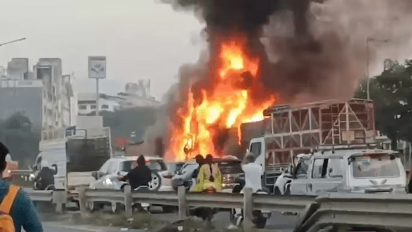 ವೇಗವಾಗಿ ಬಂದ ಕಂಟೈನರ್ ಟ್ರಕ್ ನಿಯಂತ್ರಣ ತಪ್ಪಿ ಹೆದ್ದಾರಿಯಲ್ಲಿ ಸಾಲು ಸಾಲು ನಿಂತಿದ್ದ ವಾಹನಗಳ ಮೇಲೆ ಟ್ರಕ್ ಹರಿದು ಹೋಗಿದೆ. ಟ್ರಕ್‌ ಹರಿದ ಪರಿಣಾಮ ಬೆಂಕಿ ಹೊತ್ತಿಕೊಂಡಿದ್ದು, ಕಾರು ಸಂಪೂರ್ಣ ನಜ್ಜುಗುಜ್ಜಾಗಿ ಭಸ್ಮವಾಗಿದೆ. ಟ್ರಕ್ ಸಹ ಬೆಂಕಿಗೆ ಆಹುತಿಯಾಗಿದೆ. ಪ್ರಾಥಮಿಕ ವರದಿಯಂತೆ, ಮೂರು ವಾಹನಗಳು ಬೆಂಕಿಯಲ್ಲಿ ಸುಟ್ಟುಹೋಗಿವೆ.
