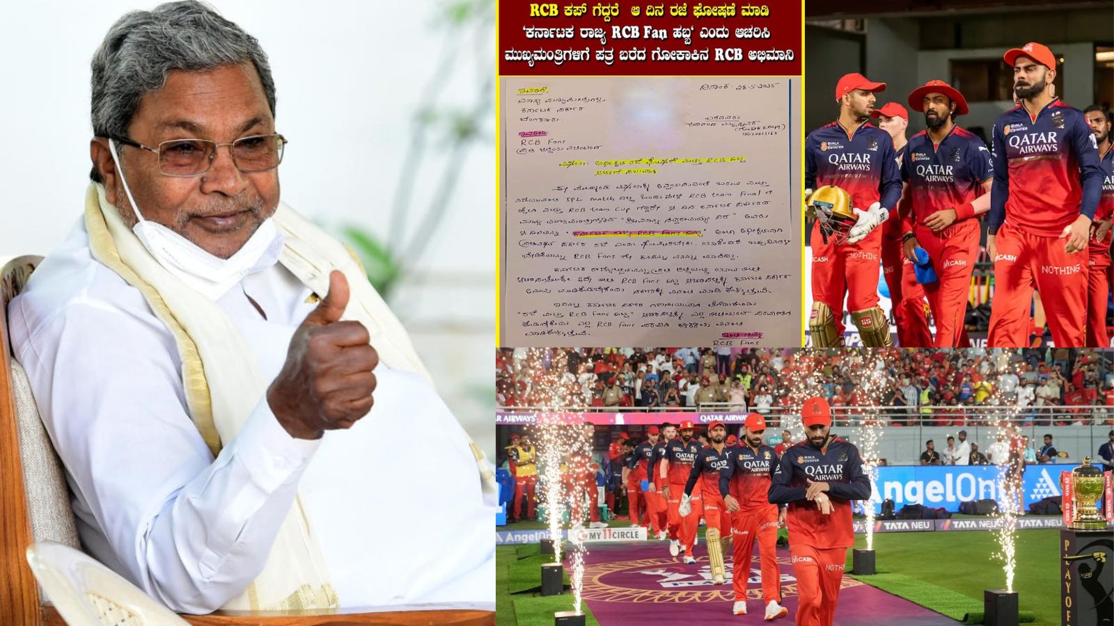 ಈ ನಡುವೆ, ಬೆಳಗಾವಿ ಜಿಲ್ಲೆಯ ಗೋಕಾಕ್‌ನ ಶಿವಾನಂದ ಮಲ್ಲನ್ನವರ್ ಎಂಬ ಆರ್‌ಸಿಬಿ ಅಭಿಮಾನಿ ಕರ್ನಾಟಕದ ಮುಖ್ಯಮಂತ್ರಿ ಸಿದ್ದರಾಮಯ್ಯ ಅವರಿಗೆ ಕೈಬರೆಹದ ಪತ್ರವೊಂದನ್ನು ಬರೆದು ವಿಶೇಷ ಮನವಿಯನ್ನು ಮಾಡಿದ್ದಾರೆ. ಆರ್‌ಸಿಬಿ ಐಪಿಎಲ್ 2025ರ ಟ್ರೋಫಿಯನ್ನು ಗೆದ್ದರೆ, ಜೂನ್ 3ರಂದು ರಾಜ್ಯದಾದ್ಯಂತ ಸಾರ್ವತ್ರಿಕ ರಜೆ ಘೋಷಿಸಿ, ಆ ದಿನವನ್ನು “ಆರ್‌ಸಿಬಿ ಫ್ಯಾನ್ಸ್ ಫೆಸ್ಟಿವಲ್ ಡೇ” ಎಂದು ಆಚರಿಸುವಂತೆ ಒತ್ತಾಯಿಸಿದ್ದಾರೆ. ಈ ದಿನವನ್ನು ಕರ್ನಾಟಕ ರಾಜ್ಯೋತ್ಸವದಂತೆ ರಾಜ್ಯಾದ್ಯಂತ ಆಚರಿಸಲು ವ್ಯವಸ್ಥೆ ಮಾಡಬೇಕೆಂದು ಅವರು ಸರ್ಕಾರಕ್ಕೆ ಮನವಿ ಮಾಡಿದ್ದಾರೆ. ಈ ಪತ್ರ ಸಾಮಾಜಿಕ ಜಾಲತಾಣಗಳಲ್ಲಿ ವೈರಲ್ ಆಗಿದ್ದು, ರಾಜ್ಯಾದ್ಯಂತ ಚರ್ಚೆಗೆ ಕಾರಣವಾಗಿದೆ.